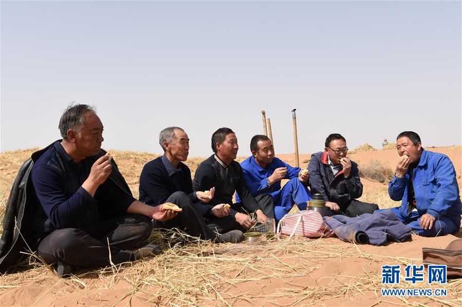 在甘肅省古浪縣境內(nèi)的黑崗沙風(fēng)沙口,八步沙第二代治沙人賀中強(qiáng)(左一)、郭萬剛(左二)、石銀山(左三)、羅興全(右三)、程生學(xué)(右二)、王志鵬(右一)在休息間隙吃午飯(3月26日攝)。二十世紀(jì)八十年代,八步沙是騰格里沙漠南緣甘肅省古浪縣最大的風(fēng)沙口。當(dāng)?shù)亓荒挲g加在一起近300歲的老漢,在承包沙漠的合同書上按下手印,誓用白發(fā)換綠洲。38年過去,六老漢只剩兩位在世。