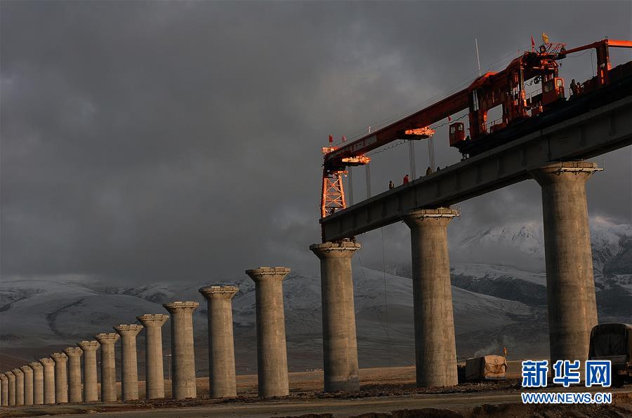青藏鐵路在架橋施工中(2004年資料照片)。新華社記者覺(jué)果攝