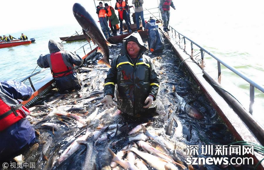 在河南省洛陽市嵩縣,第三屆陸渾開漁節(jié)啟幕,捕撈隊員們在湖心零下十幾度的溫度下開始捕魚,收獲新年“第一網(wǎng)”——超10噸魚,現(xiàn)場一派魚躍人歡的喜悅景象。