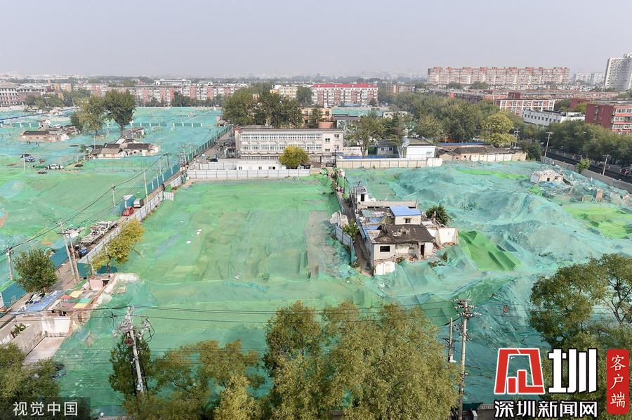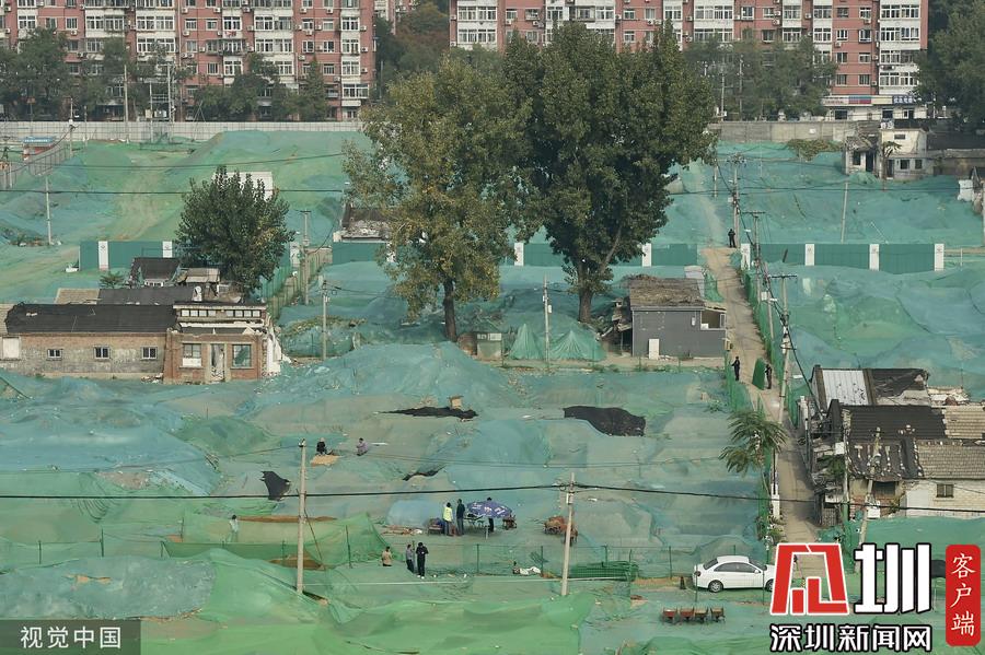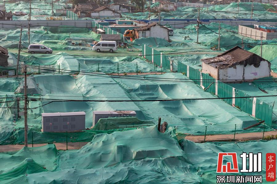 圍擋內(nèi),工地大部分被綠色苫布覆蓋,只露出幾處規(guī)整的探坑??脊殴ぷ髡哒诰o張忙碌中,有些工作人員戴著草帽,坐在馬扎上記錄發(fā)掘細(xì)節(jié),還有一些穿著藍(lán)色背心的工作人員使用工具正在做清理工作。