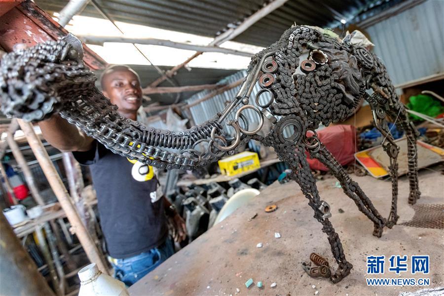 12月20日,在肯尼亞內羅畢庫奧納藝術中心,一名藝術家展示裝置藝術作品。成立于1995年的庫奧納藝術中心位于肯尼亞首都內羅畢市區(qū),目前有17間雕塑、繪畫等藝術工作室。中心不定期舉辦藝術展覽活動,園區(qū)內陳列有各類涂鴉墻及裝置藝術作品。 新華社記者 王騰 攝