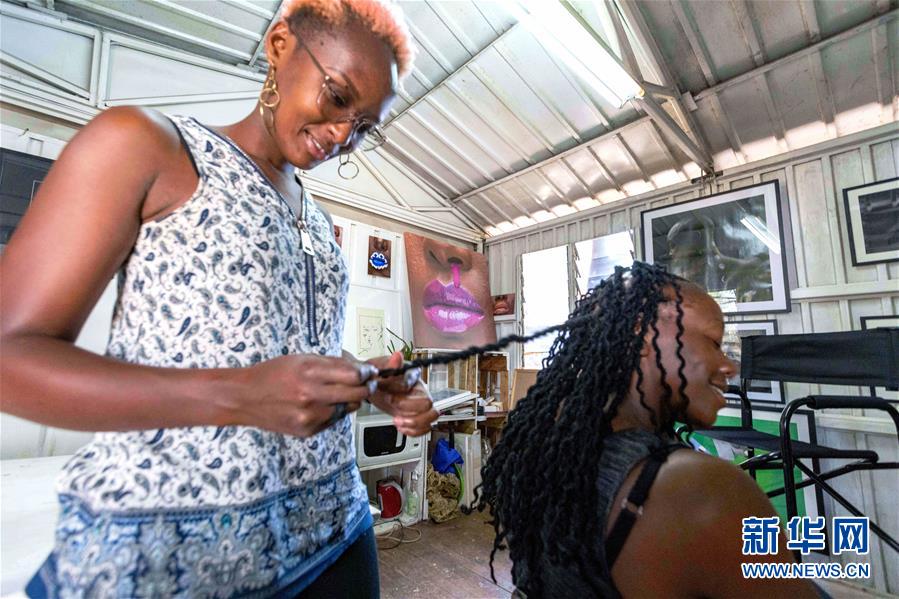 12月20日,在肯尼亞內(nèi)羅畢庫奧納藝術(shù)中心,一名藝術(shù)家為游客編辮子。 新華社記者 王騰 攝