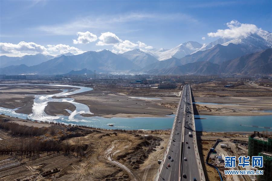 鳥瞰拉薩納金大橋(4月3日無人機(jī)拍攝)。新華社記者晉美多吉攝