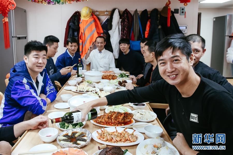 2019年2月5日,在比利時安特衛(wèi)普港,船員們在“中遠海運天秤座”號餐廳里共享遲來的年夜飯。由于駛離漢堡港的時間出現(xiàn)延誤,超大型集裝箱船“中遠海運天秤座”號在2月5日農歷正月初一凌晨兩點才抵達安特衛(wèi)普港,遠洋海員們終于可以開懷暢飲,歡喜過年。 新華社記者 張鋮 攝