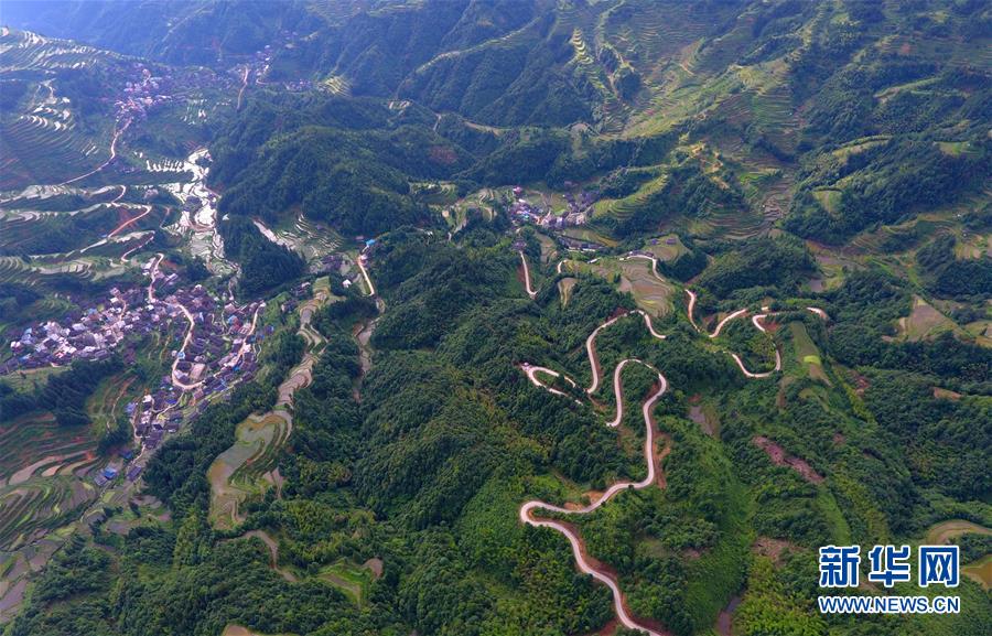 這是融水苗族自治縣桿洞鄉(xiāng)百秀村孔門苗寨的公路(6月14日無人機(jī)拍攝)。新華社記者黃孝邦攝
