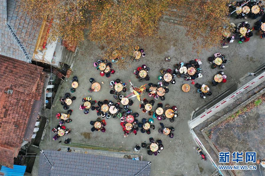 烏英苗寨村民在新蘆笙柱下吃百家宴(12月22日無人機(jī)拍攝)。新華社記者黃孝邦攝