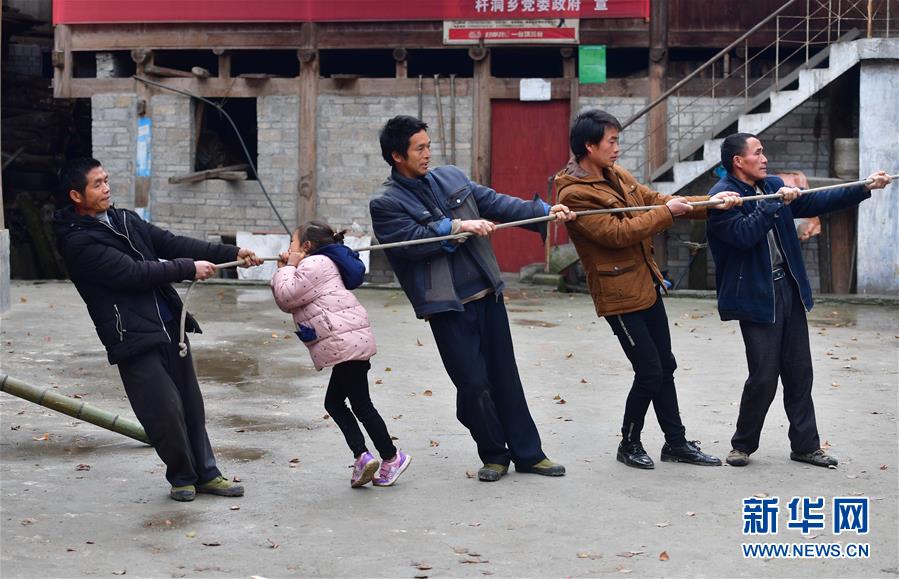 烏英苗寨村民合力抬木頭下山,準(zhǔn)備制作蘆笙柱(12月2日攝)。新華社記者黃孝邦攝
