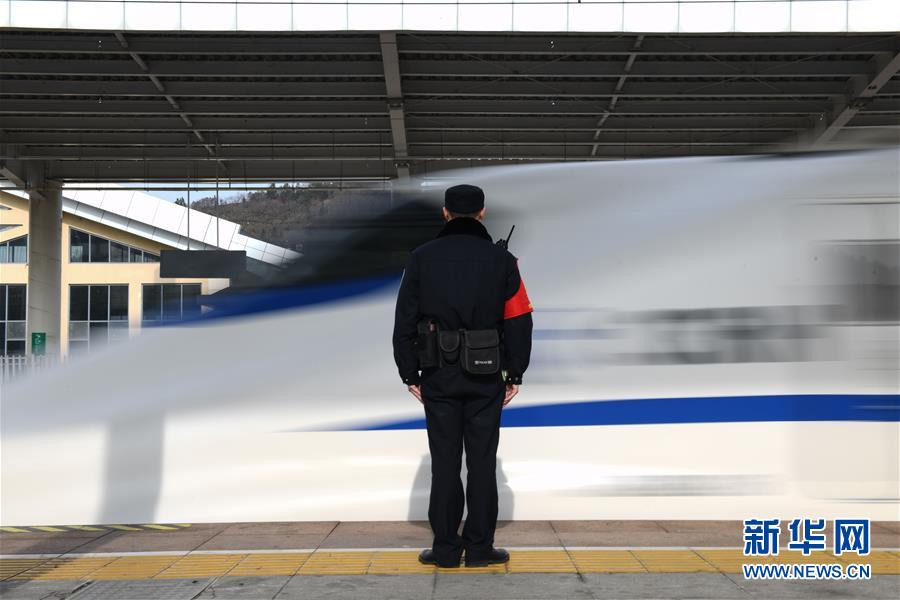 金寨火車站派出所民警張嗣一在站臺接車(12月19日攝)。安徽合肥鐵路公安處金寨火車站派出所位于大別山腹地。在這里,除了所領導外,青年民警平均年齡不到29歲。他們遠離家鄉(xiāng),扎根大山深處的小站派出所,戰(zhàn)斗在守護客運平安的第一線。新華社記者張端攝
