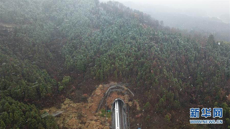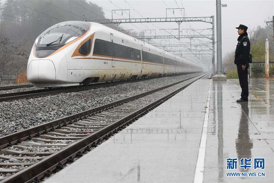 列車駛出金寨火車站派出所管轄的鐵路線路(12月19日無人機(jī)拍攝)。新華社記者張端攝