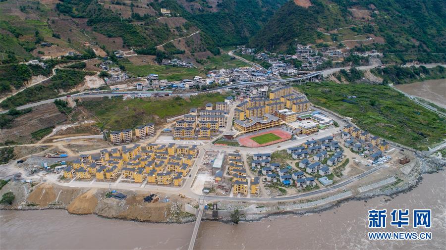 建于怒江邊的大興地鎮(zhèn)維拉壩“珠海小區(qū)”內(nèi)的學校和住房已初現(xiàn)規(guī)模(6月24日無人機拍攝)。新華社記者胡超攝