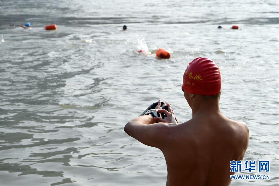 12月20日,一名冬泳愛好者在進(jìn)入黃河冬泳前給自己計(jì)時(shí)。新華社記者馬寧攝