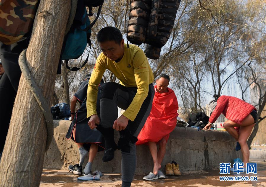 12月20日,冬泳愛(ài)好者在黃河中冬泳后在河邊換衣服。新華社記者馬寧攝