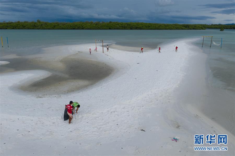 12月8日,在印度尼西亞邦加勿里洞省,李嘉文(左下)帶領(lǐng)工人在李王島的白色海床清理垃圾(無人機(jī)拍攝)。 新華社記者杜宇攝