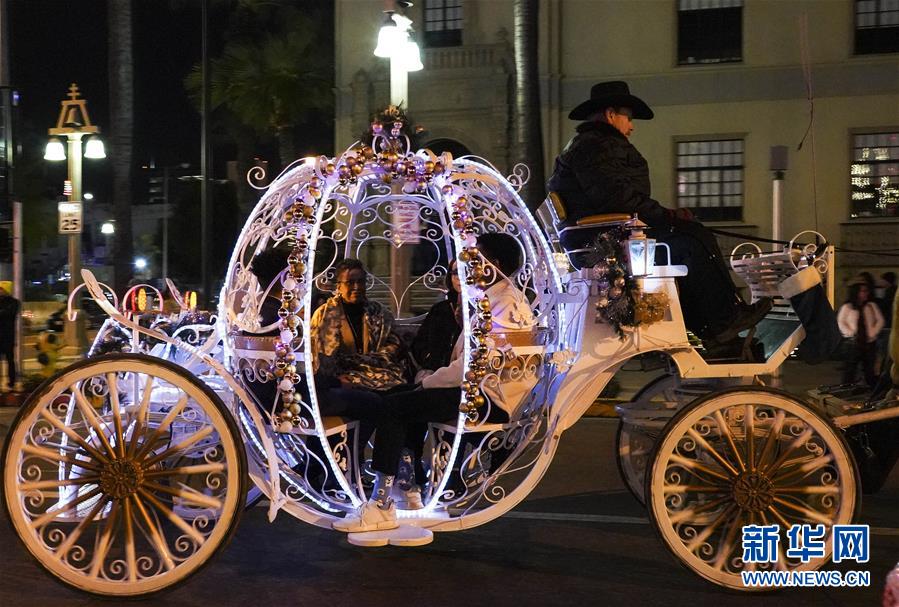 12月29日,人們?cè)诿绹?guó)加利福尼亞州里弗賽德燈光節(jié)上乘坐馬車。 新華社記者李穎攝
