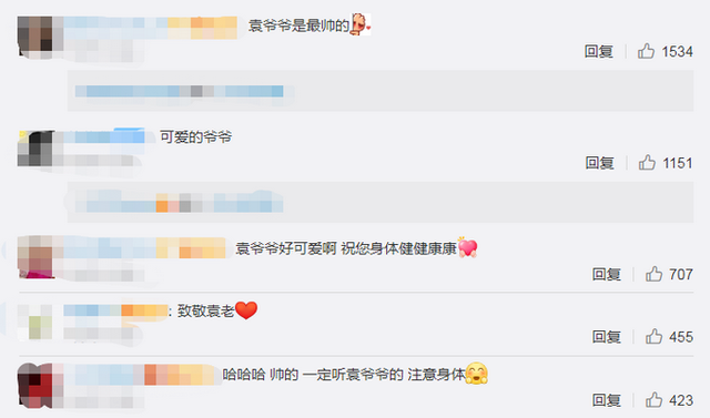 網(wǎng)友看后,紛紛評(píng)論,“袁爺爺是帥的”,“一定聽(tīng)袁爺爺話(huà)注意身體”!
