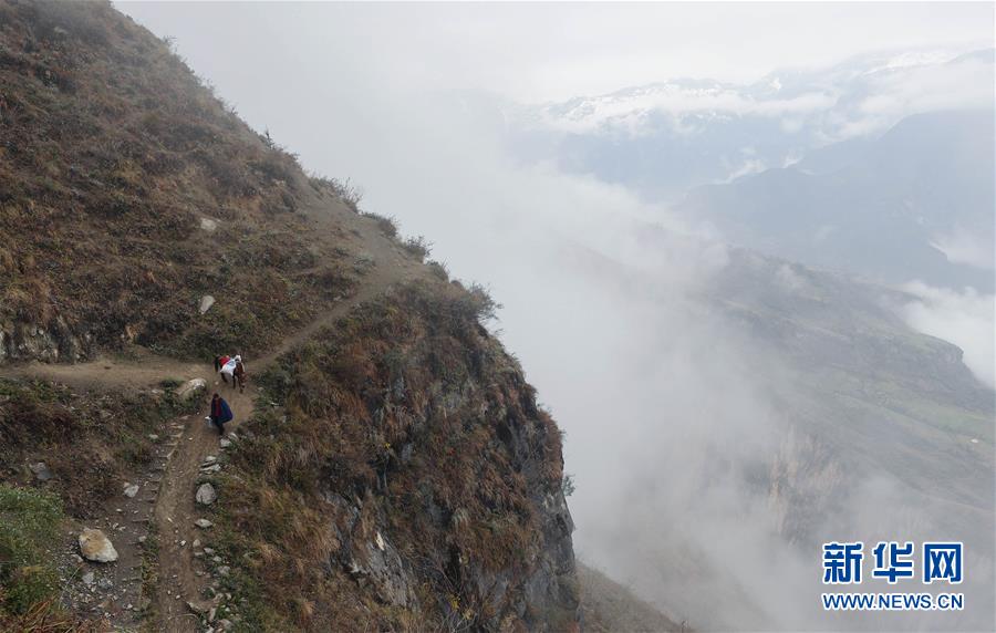 阿布洛哈村村民阿達(dá)色貴牽著馬馱運(yùn)物資到村子里(2016年12月1日攝)。