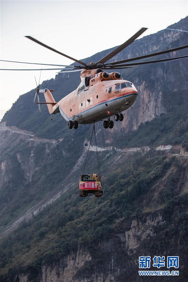 米-26重型直升機吊運一臺挖掘機飛抵阿布洛哈村上空(2019年12月5日攝)。通村公路的施工單位四川路橋租用一架米-26重型運輸直升機,克服高山峽谷、天氣多變等不利因素,從布拖縣城吊運大型施工設備到阿布洛哈村,為兩邊分頭掘進施工提供大型機械保障。新華社記者江宏景攝