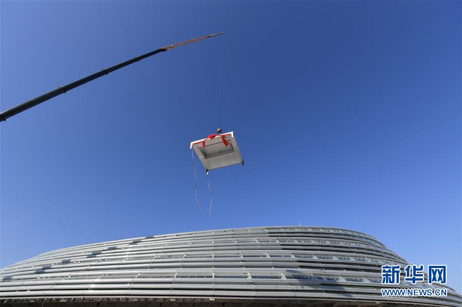 12月31日,施工人員在國(guó)家速滑館施工現(xiàn)場(chǎng)起吊最后一塊待安裝的屋面單元板塊。新華社記者鞠煥宗攝