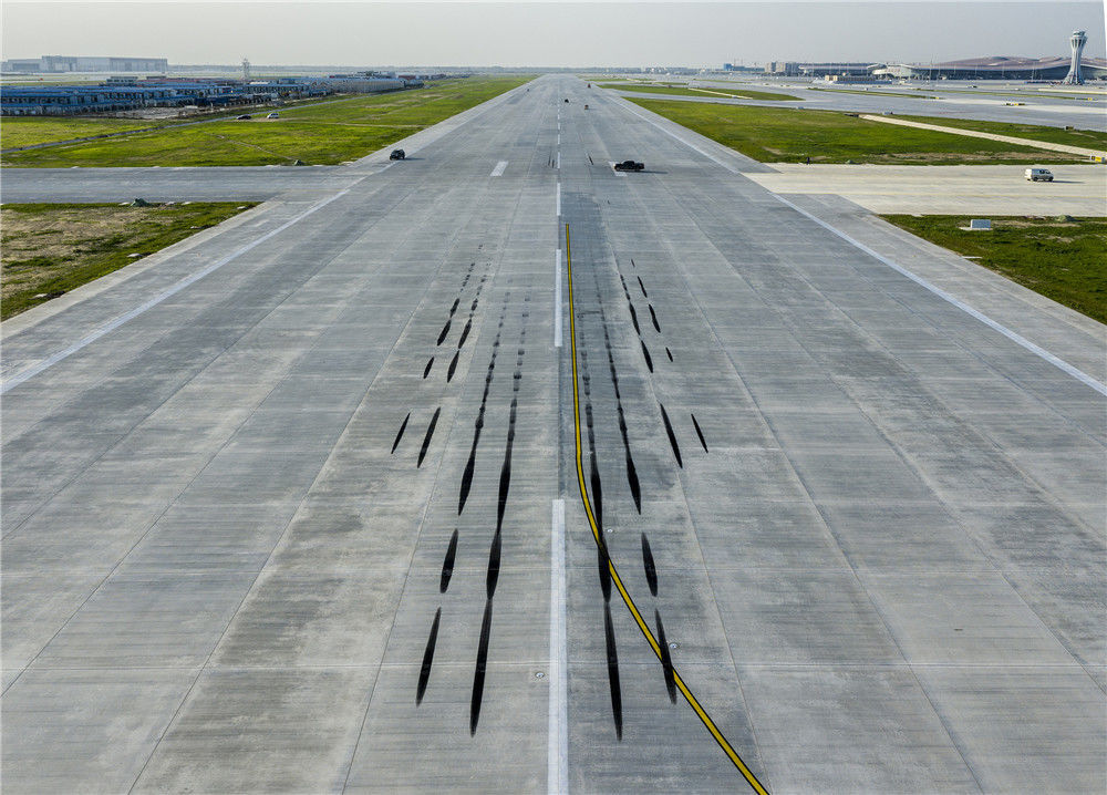 2019年5月29日,北京大興國(guó)際機(jī)場(chǎng),飛機(jī)在跑道上留下的痕跡。馬文曉/視覺(jué)中國(guó)