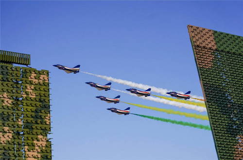 2019年10月21日,在吉林長(zhǎng)春舉行的慶祝人民空軍成立70周年航空開放活動(dòng)上,空軍八一飛行表演隊(duì)殲-10飛機(jī)編隊(duì)從靜態(tài)展示的新型雷達(dá)上空飛過。新華社發(fā)(萬全攝)