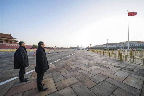 2019年12月7日,新任香港特區(qū)政府警務(wù)處處長鄧炳強(qiáng)(右)率香港警務(wù)處代表團(tuán)來到北京天安門廣場,觀看升國旗儀式。新華社記者殷剛攝