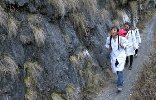 2019年1月13日,在云南省貢山縣丙中洛鎮(zhèn),管延萍(左)與同事走在進(jìn)村的山路上。管延萍從經(jīng)濟(jì)發(fā)達(dá)的珠三角地區(qū),自愿到深度貧困地區(qū)云南怒江傈僳族自治州參加?xùn)|西部扶貧協(xié)作,并主動申請將期限從半年延長至3年。 新華社記者張加揚(yáng)攝