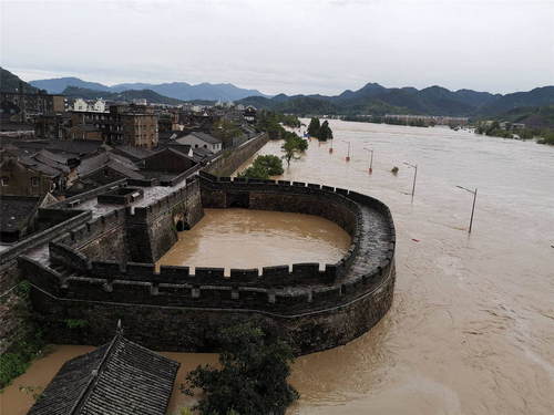 2019年8月,超強臺風“利奇馬”引發(fā)的洪水圍困浙江省臨海市。這是8月10日拍攝的被洪水圍困的臨海古城(無人機照片)。新華社發(fā)