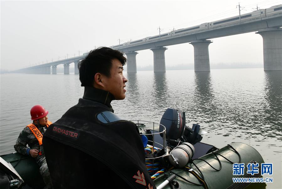 1月3日,潛水員李壯看著飛馳而過的列車準(zhǔn)備潛水檢查橋墩。新華社記者 朱崢攝