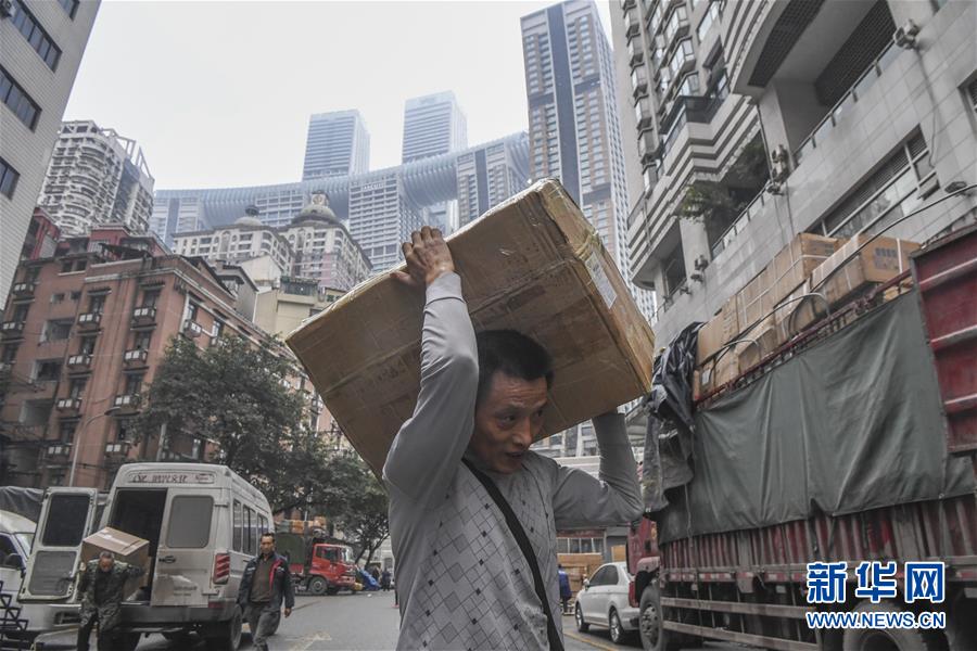 冉光輝在重慶朝天門搬運貨物(1月5日攝)。新華社記者王全超攝