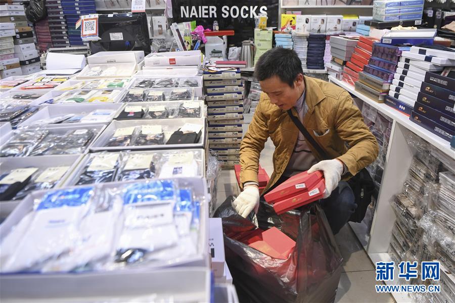 冉光輝在重慶朝天門大正商場內整理即將搬運的貨物(1月5日攝)。新華社記者王全超攝