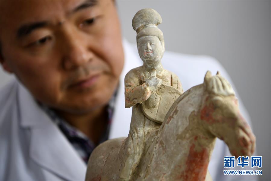 2019年12月27日,在天水市博物館文物保護(hù)修復(fù)中心陶、玉石器文物修復(fù)室,專業(yè)技術(shù)人員孟旭輝在觀察一件唐代彩繪陶俑的病害情況。 甘肅省天水市博物館文物保護(hù)修復(fù)中心有一支專業(yè)的文物修復(fù)隊(duì)伍,共有14名專業(yè)技術(shù)人員。從2012年正式成立以來,他們不僅承擔(dān)著對館藏和館外文物的修復(fù)工作,還參與了多次文化遺存的調(diào)查和搶救性發(fā)掘、古建筑彩畫保護(hù)、古墓葬搬遷復(fù)原等工作。一件件殘缺破損、滿身病害的文物經(jīng)過他們的巧手修復(fù),又重新煥發(fā)光彩,展示在公眾面前。 新華社記者 馬寧 攝