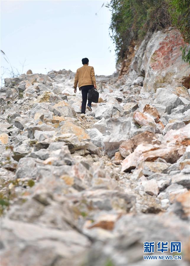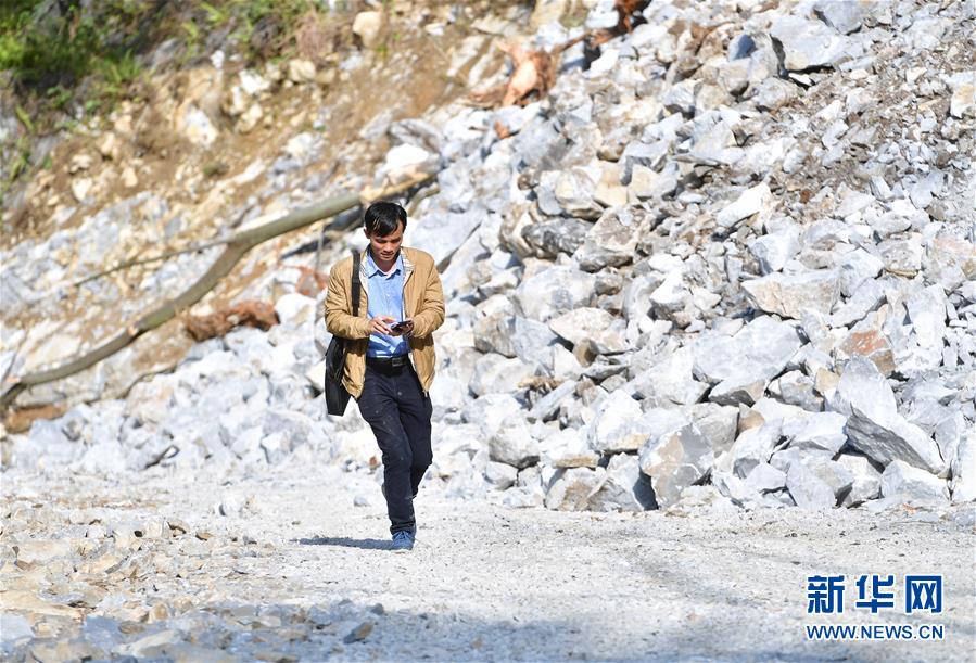八好村駐村第一書(shū)記韋德王徒步前往弄麻屯開(kāi)展扶貧工作,弄麻屯的公路尚在建設(shè)當(dāng)中(2019年12月16日攝)。新華社記者黃孝邦攝