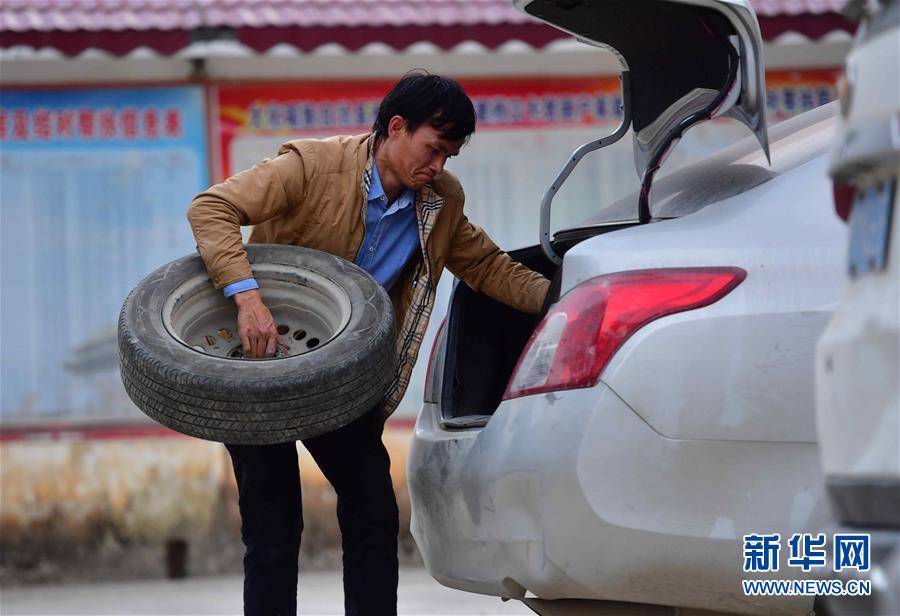 八好村駐村第一書(shū)記韋德王將汽車備胎放入后備箱(2019年12月16日攝)。新華社記者黃孝邦攝