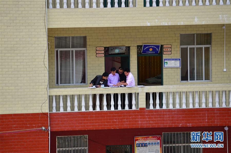 八好村駐村第一書(shū)記韋德王(左二)和同事在辦公樓里討論工作(2019年11月12日攝)。新華社記者黃孝邦攝