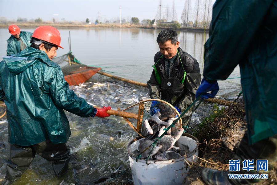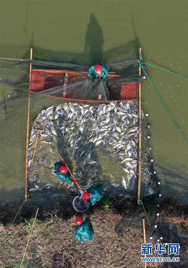 12月28日,漁民們?cè)诹夂?zhèn)盛江家庭農(nóng)場(chǎng)捕魚(yú)。