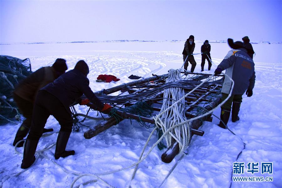 民眾鑿冰下網(wǎng)捕魚(yú)。