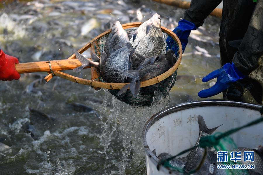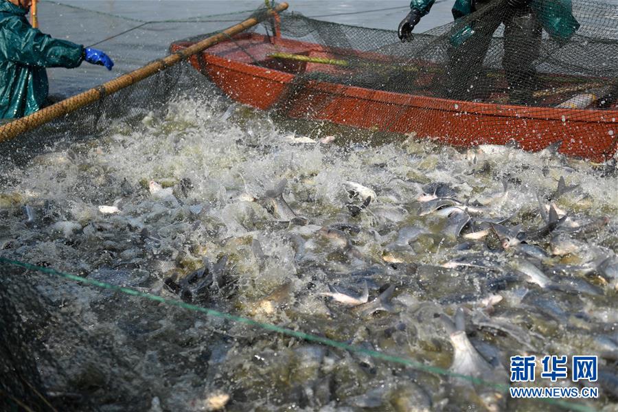 12月18日,一名工作人員將捕撈上來(lái)的魚(yú)放入筐中。新華社記者劉磊攝