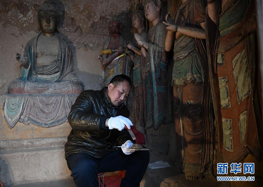 12月25日,在麥積山石窟第11窟,修復(fù)師牟常有對塑像破損處進行加固處理。