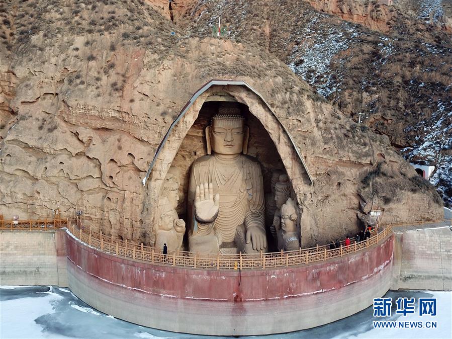 1月11日,游客在參觀天梯山石窟13號(hào)窟(無(wú)人機(jī)照片)。新華社記者馬寧攝
