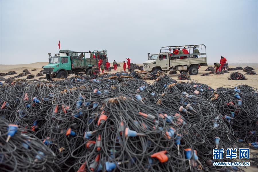 1月14日,放線工在出工前將一捆捆檢波器裝車。地球物理勘探是油氣開發(fā)的第一步,相當(dāng)于給地球做CT。物探工人按照嚴(yán)格的測線部署,在相應(yīng)位置鉆井,然后實(shí)施地震,采集地震波數(shù)據(jù)??蒲腥藛T通過數(shù)據(jù)組成的“CT片”,就能夠清晰地“看”到地下的地質(zhì)結(jié)構(gòu),判斷哪里埋藏有石油或者天然氣。2019年10月,東方地球物理勘探有限責(zé)任公司塔里木物探處2113隊(duì)進(jìn)入新疆塔克拉瑪干沙漠腹地,開始中古14-21、塔中2兩個區(qū)塊的三維地震勘探。近2000名物探工人將在1000平方公里的范圍內(nèi)一直工作到2020年4月,這也意味著他們將在塔克拉瑪干沙漠腹地連續(xù)度過第14個除夕夜。蘊(yùn)藏著豐富石油天然氣資源的新疆塔克拉瑪干沙漠有“死亡之?!敝Q,氣候干燥,年降水量在50毫米以下,冬季地表最低溫度超過零下30攝氏度,是世界油氣勘探難度最大的地區(qū)之一。為避開風(fēng)季,物探工人每年9、10月份進(jìn)入沙漠,一直工作到來年4月,夜以繼日與黃沙、嚴(yán)寒為伴,用辛勤的汗水,為祖國找油找氣。新華社記者丁磊攝