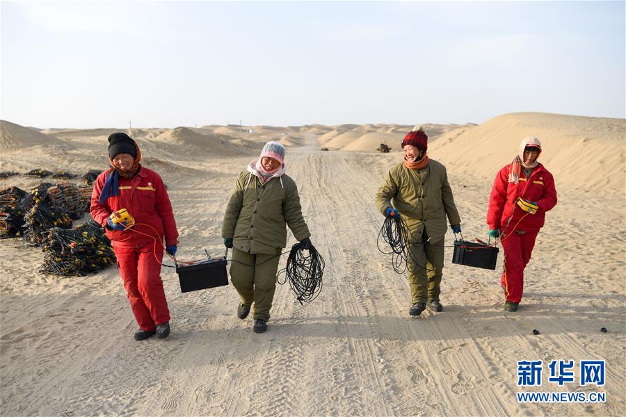 1月14日,4名測線女工抬著電瓶返回營地。地球物理勘探是油氣開發(fā)的第一步,相當(dāng)于給地球做CT。物探工人按照嚴(yán)格的測線部署,在相應(yīng)位置鉆井,然后實(shí)施地震,采集地震波數(shù)據(jù)??蒲腥藛T通過數(shù)據(jù)組成的“CT片”,就能夠清晰地“看”到地下的地質(zhì)結(jié)構(gòu),判斷哪里埋藏有石油或者天然氣。2019年10月,東方地球物理勘探有限責(zé)任公司塔里木物探處2113隊(duì)進(jìn)入新疆塔克拉瑪干沙漠腹地,開始中古14-21、塔中2兩個區(qū)塊的三維地震勘探。近2000名物探工人將在1000平方公里的范圍內(nèi)一直工作到2020年4月,這也意味著他們將在塔克拉瑪干沙漠腹地連續(xù)度過第14個除夕夜。蘊(yùn)藏著豐富石油天然氣資源的新疆塔克拉瑪干沙漠有“死亡之?!敝Q,氣候干燥,年降水量在50毫米以下,冬季地表最低溫度超過零下30攝氏度,是世界油氣勘探難度最大的地區(qū)之一。為避開風(fēng)季,物探工人每年9、10月份進(jìn)入沙漠,一直工作到來年4月,夜以繼日與黃沙、嚴(yán)寒為伴,用辛勤的汗水,為祖國找油找氣。新華社記者丁磊攝