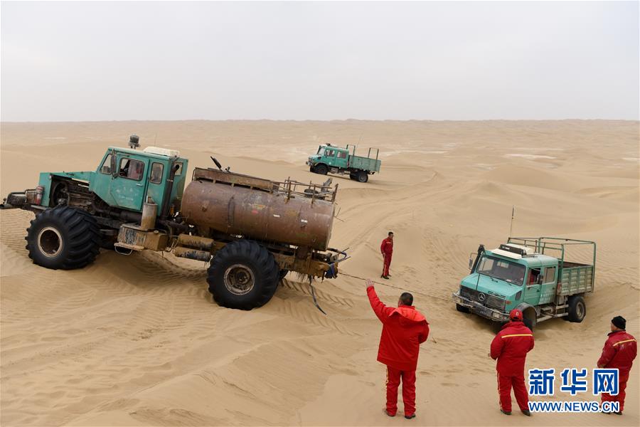一輛測量作業(yè)車陷在沙坑中,水罐車進(jìn)行營救(1月13日攝)。地球物理勘探是油氣開發(fā)的第一步,相當(dāng)于給地球做CT。物探工人按照嚴(yán)格的測線部署,在相應(yīng)位置鉆井,然后實(shí)施地震,采集地震波數(shù)據(jù)??蒲腥藛T通過數(shù)據(jù)組成的“CT片”,就能夠清晰地“看”到地下的地質(zhì)結(jié)構(gòu),判斷哪里埋藏有石油或者天然氣。2019年10月,東方地球物理勘探有限責(zé)任公司塔里木物探處2113隊(duì)進(jìn)入新疆塔克拉瑪干沙漠腹地,開始中古14-21、塔中2兩個區(qū)塊的三維地震勘探。近2000名物探工人將在1000平方公里的范圍內(nèi)一直工作到2020年4月,這也意味著他們將在塔克拉瑪干沙漠腹地連續(xù)度過第14個除夕夜。蘊(yùn)藏著豐富石油天然氣資源的新疆塔克拉瑪干沙漠有“死亡之?!敝Q,氣候干燥,年降水量在50毫米以下,冬季地表最低溫度超過零下30攝氏度,是世界油氣勘探難度最大的地區(qū)之一。為避開風(fēng)季,物探工人每年9、10月份進(jìn)入沙漠,一直工作到來年4月,夜以繼日與黃沙、嚴(yán)寒為伴,用辛勤的汗水,為祖國找油找氣。新華社記者丁磊攝