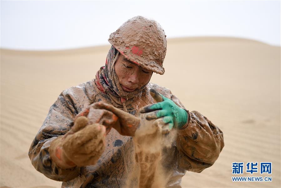 1月13日,鉆井工潘洪星用沙子帶出手套里的泥水。地球物理勘探是油氣開發(fā)的第一步,相當(dāng)于給地球做CT。物探工人按照嚴(yán)格的測線部署,在相應(yīng)位置鉆井,然后實(shí)施地震,采集地震波數(shù)據(jù)。科研人員通過數(shù)據(jù)組成的“CT片”,就能夠清晰地“看”到地下的地質(zhì)結(jié)構(gòu),判斷哪里埋藏有石油或者天然氣。2019年10月,東方地球物理勘探有限責(zé)任公司塔里木物探處2113隊(duì)進(jìn)入新疆塔克拉瑪干沙漠腹地,開始中古14-21、塔中2兩個區(qū)塊的三維地震勘探。近2000名物探工人將在1000平方公里的范圍內(nèi)一直工作到2020年4月,這也意味著他們將在塔克拉瑪干沙漠腹地連續(xù)度過第14個除夕夜。蘊(yùn)藏著豐富石油天然氣資源的新疆塔克拉瑪干沙漠有“死亡之?!敝Q,氣候干燥,年降水量在50毫米以下,冬季地表最低溫度超過零下30攝氏度,是世界油氣勘探難度最大的地區(qū)之一。為避開風(fēng)季,物探工人每年9、10月份進(jìn)入沙漠,一直工作到來年4月,夜以繼日與黃沙、嚴(yán)寒為伴,用辛勤的汗水,為祖國找油找氣。新華社記者丁磊攝