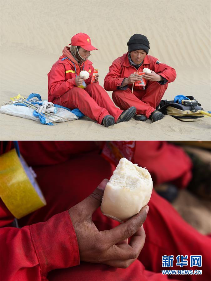 這是一張拼版圖片:上圖為測量工周國燕(左)和丈夫杞朝金在沙漠中解決午餐(1月13日攝);下圖為測量工周國燕在吃冰涼的饅頭(1月13日攝)。地球物理勘探是油氣開發(fā)的第一步,相當(dāng)于給地球做CT。物探工人按照嚴(yán)格的測線部署,在相應(yīng)位置鉆井,然后實(shí)施地震,采集地震波數(shù)據(jù)??蒲腥藛T通過數(shù)據(jù)組成的“CT片”,就能夠清晰地“看”到地下的地質(zhì)結(jié)構(gòu),判斷哪里埋藏有石油或者天然氣。2019年10月,東方地球物理勘探有限責(zé)任公司塔里木物探處2113隊(duì)進(jìn)入新疆塔克拉瑪干沙漠腹地,開始中古14-21、塔中2兩個區(qū)塊的三維地震勘探。近2000名物探工人將在1000平方公里的范圍內(nèi)一直工作到2020年4月,這也意味著他們將在塔克拉瑪干沙漠腹地連續(xù)度過第14個除夕夜。蘊(yùn)藏著豐富石油天然氣資源的新疆塔克拉瑪干沙漠有“死亡之?!敝Q,氣候干燥,年降水量在50毫米以下,冬季地表最低溫度超過零下30攝氏度,是世界油氣勘探難度最大的地區(qū)之一。為避開風(fēng)季,物探工人每年9、10月份進(jìn)入沙漠,一直工作到來年4月,夜以繼日與黃沙、嚴(yán)寒為伴,用辛勤的汗水,為祖國找油找氣。新華社記者丁磊攝