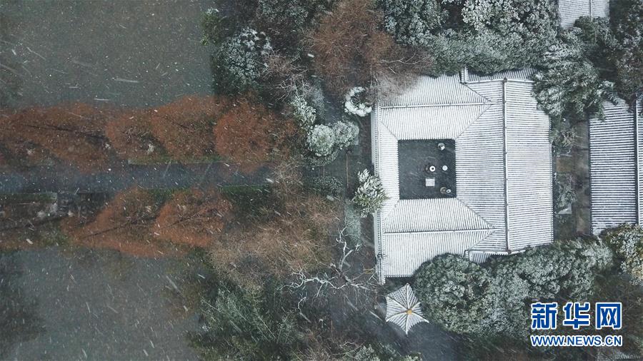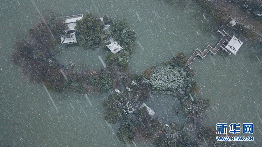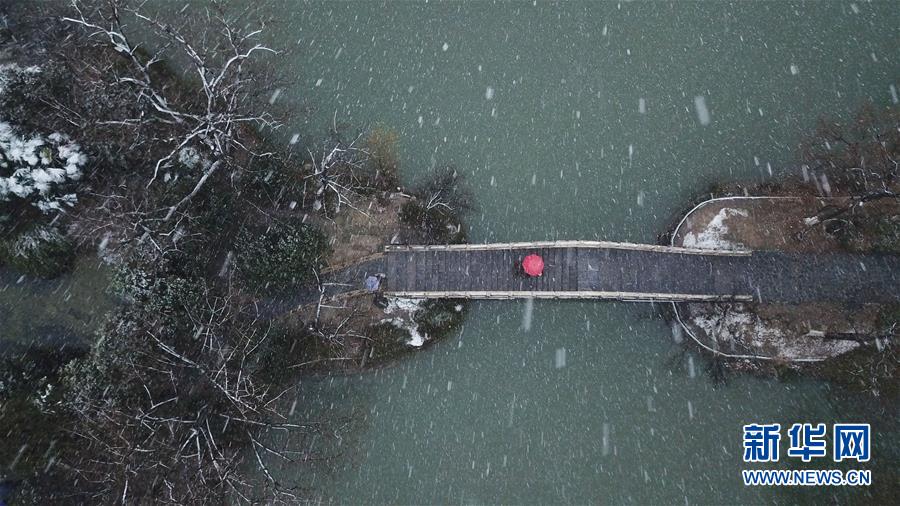 1月15日,幾名游客在雪中的合肥市包公園參觀(無人機照片)。 當日,安徽省合肥市迎來降雪天氣。雪中的合肥市包公園景色別致。 新華社記者 張端 攝