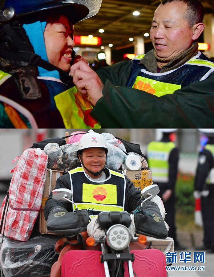 拼版照片:上圖是來自江西吉安的陳海平(右)在中國(guó)石油泉州博覽大道站給愛人郭九香整理摩托車頭盔(1月15日攝)。夫妻倆在福建泉州打工十多年,連續(xù)九年騎著摩托車返鄉(xiāng),他們表示過完年后還將再來泉州工作。