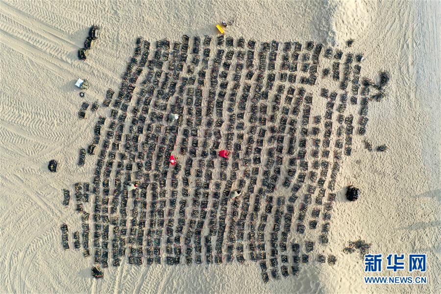 放線女工在塔克拉瑪干沙漠腹地進(jìn)行放線工作(無人機(jī)照片,1月14日攝)。