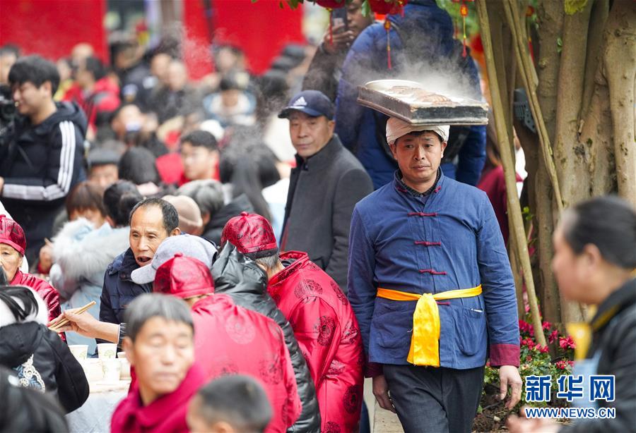 2019年1月26日,重慶中山古鎮(zhèn),880桌“千米長宴”5萬人共品年味。身著紅色對襟外套,光腳穿著草鞋的62歲老人楊光祥展示了他的絕活——“打盆上菜”。