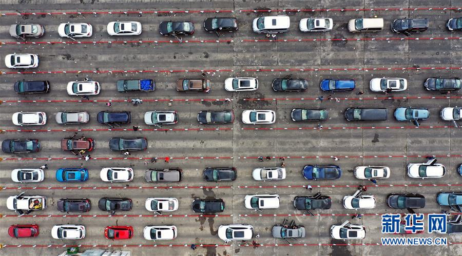 1月19日,車輛在海口秀英港輪渡碼頭等待登船(無(wú)人機(jī)照片)。 新華社記者 郭程 攝