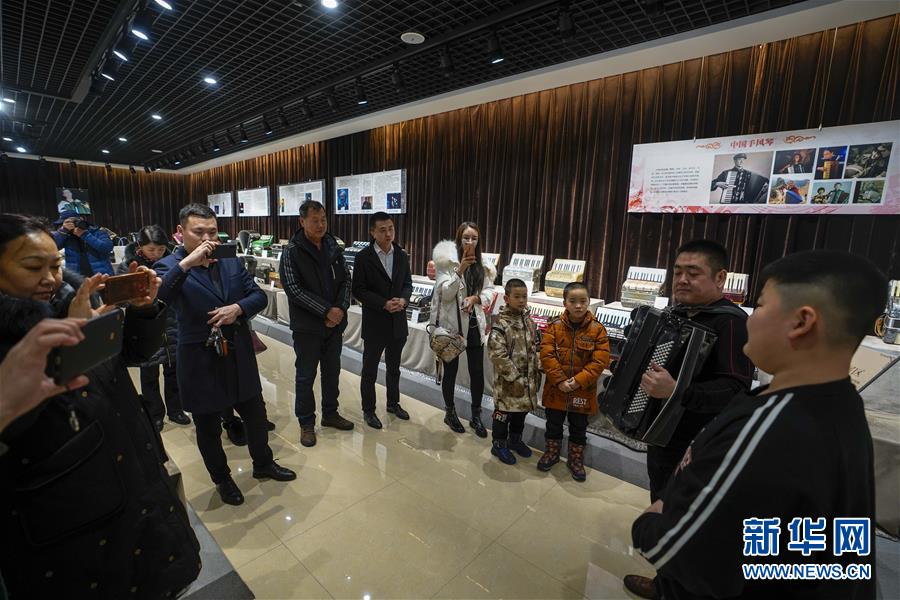 在塔城市手風(fēng)琴博物館,當(dāng)?shù)匚乃噽酆谜邽橛慰脱葑嗍诛L(fēng)琴(1月21日攝)。新華社記者 趙戈 攝
